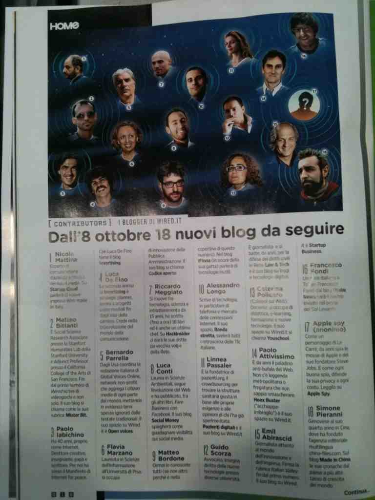 Sono in buona compagnia. Siamo infatti in 18 blogger ad inaugurare questa nuova collaborazione con Wired, la testata diretta da Riccardo Luna: Nicola Mattina, Matteo Bittanti,Paolo Iabichino, Luca De Fino, Bernardo Parrella, Flavia Marzano, Riccardo Meggiato,Luca Conti, Matteo Bordone, Alessandro Longo, Linnea Passaler, Guido Scorza, Caterina Policaro, Paolo Attivissimo, Emil Abirascid, Francesco Fondi e Simone Pieranni
